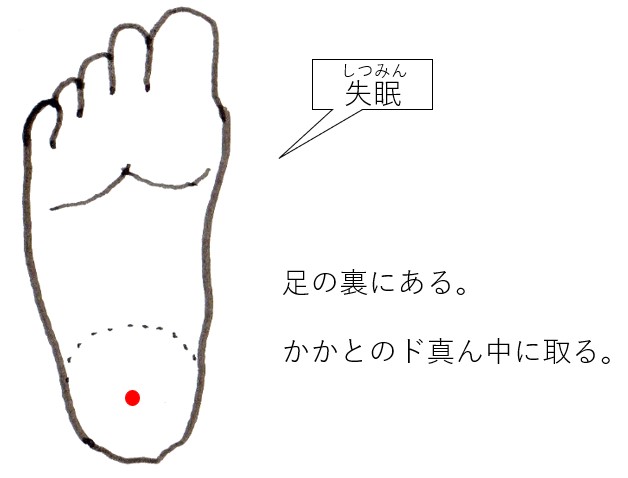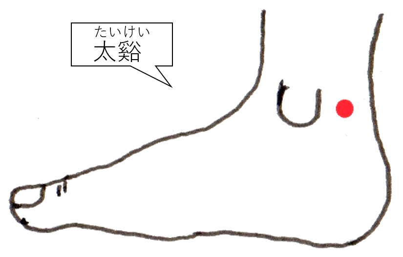 足の内側。内くるぶしの一番高いところのラインで、アキレス腱との中間。凹んでいる所にとる。