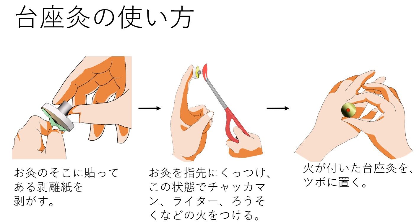 ここで気を付けなければならないことは、台座灸をツボに置いてから火をつけない、ということです。指の先に台座灸を張り付けた状態で火をつけ、その後、ツボに台座灸を置くという順番でおこなってください。やけどを避けるためです。