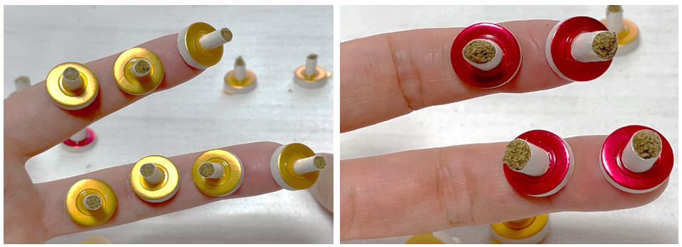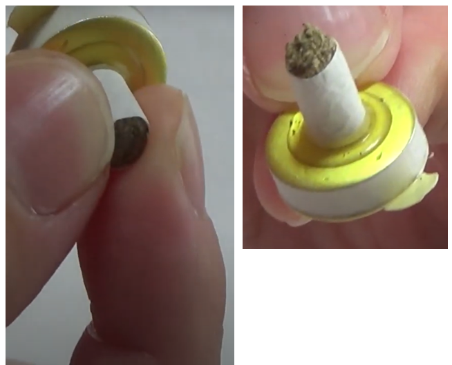 もぐさの筒の先端をもち、クリクリと押しつぶすようにさせると、もぐさが筒から飛び出てくる。筒は紙が厚みがあるので火がつきにくいが、もぐさを飛び出させ、もぐさに着火させると火が付きやすいので、着火時間を短縮できる。