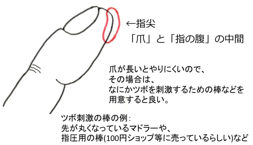 ツボを押すときは、指の先の方を皮膚に当てるとしっかりと刺激ができます。「指の腹」でもなく「爪の先」でもなく、その中間あたり。イラストで赤く囲んでいるところです。
