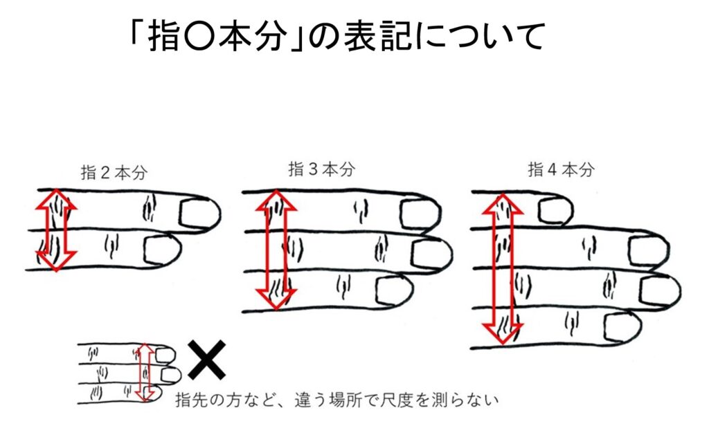 このような表現が出てきたら、図に示したように、爪から2つ目の関節のシワの位置で取ります。指2本の場合~指4本の場合までを図にしましたので、参考にしてください。