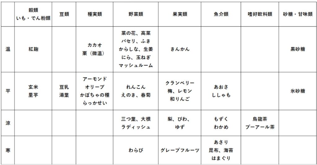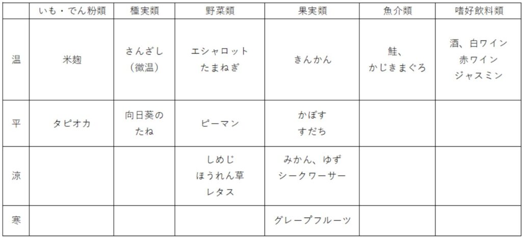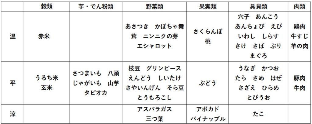 「温」体を温めます。「平」冷やしもせず温めもせず。「涼」やや体を冷やします。「寒」体を冷やします。